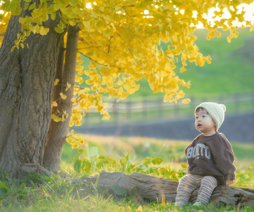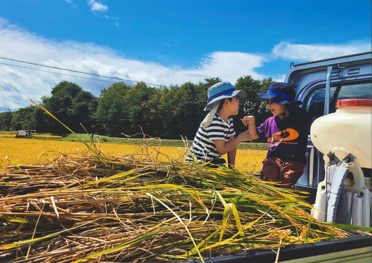 笑顔と指さしが効いています。青空・稲穂・コンバイン・子供の服装…見事な現代の農村風景をとらえました。次は子供二人のアップも狙い目です。