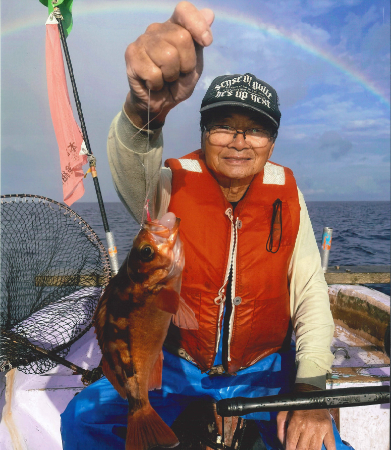 魚を釣り上げた作品は良く見ますが、この作品には虹が入っていることで「見たことない」となりました。魚をもう少し上げたポーズをとってもらうと、じいちゃんの顔と魚の影が減ります。家族アルバムにはこの題名で良いのですが、コンテストとしての題名は一考を要します。