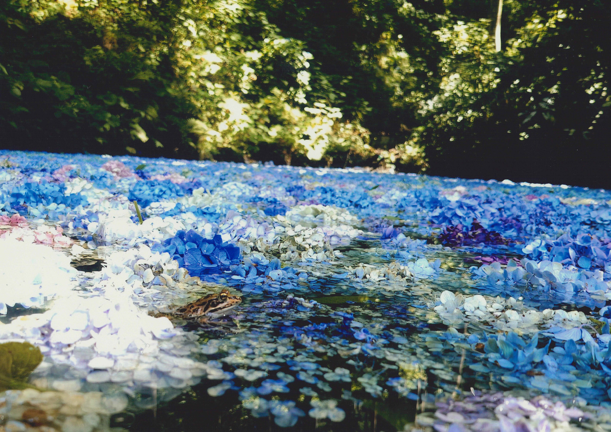 紫陽花の池にカエルを発見したことが成功です。左側の花が白飛びになりました。撮る時のマイナス補正か、撮った後のコントラスト調整なども検討してみてください。